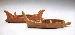 Πήλινα ομοιώματα πλοίων από το Mόχλο και το Παλαίκαστρο. Πρωτομινωική περίοδος. Ηράκλειο, Αρχαιολογικό Μουσείο 5570 και 3911. ΥΠΠΟ/ΤΑΠ.