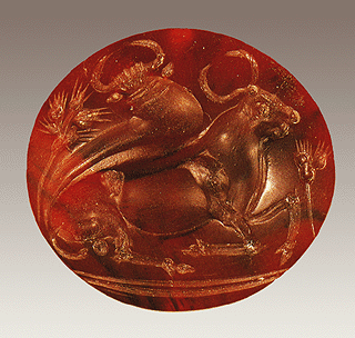 Kνωσός. Φακοειδής σφραγιδόλιθος από σάρδιο με παράσταση ταύρων. 1600-1100 π.X.