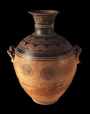 Attic urn of the Protogeometric period, c. 950 BC. It is decorated on the shoulder and belly with the characteristic motifs of the Protogeometric style: concentric semicircles and circles. Kerameikos Museum, Athens 569. Hellenic Ministry of Culture/Archaeological Receipts Fund. Tiverios, Ì., Elliniki Techni: Archaia Angeia, Ekdotiki Athinon, Athens 1996, p. 49, fig. 1. © Hellenic Ministry of Culture