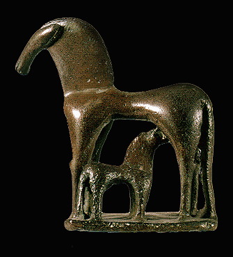 Bronze group of a mare and foal. Second quarter or mid-8th century BC. National Archaeological Museum, Athens X 7647. Hellenic Ministry of Culture/Archaeological Receipts Fund. Vokotopoulou, J., Elliniki Techni: Argyra kai Chalkina Erga Technis, Ekdotiki Athinon, Athens 1997, p. 52, fig. 12. © Hellenic Ministry of Culture