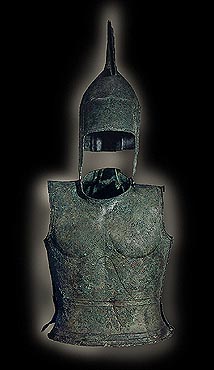 Bronze armour from Argos. 750-700 BC. It consists of a helmet and bell-shaped cuirass. Archaeological Museum, Argos B 26-27. Hellenic Ministry of Culture/Archaeological Receipts Fund. Vokotopoulou, J., Elliniki Techni: Argyra kai Chalkina Erga Technis, Ekdotiki Athinon, Athens 1997, p. 55, fig. 16. © Hellenic Ministry of Culture