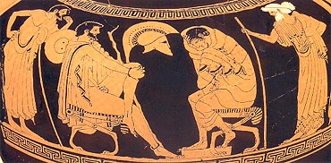 sits in a pensive mood between Diomedes, Odysseus and Phoenix who have come to persuade him to return to battle. Basle, Antikenmuseum und Sammlung Lundwig. Kakridis, J. Th., Elliniki Mythologia, vol. 5: Troikos Polemos, Ekdotiki Athinon, Athens 1986, p. 50, fig. 35. © Antikenmuseum und Sammlung Lundwig, Basle.