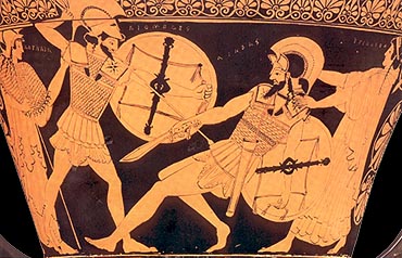 Detail from a red-figure krater representing the duel between Diomedes and Aeneas. 490-480 BC. With the aid of Athena, Diomedes attacks and wounds Aeneas, who is supported by Aphrodite. Boston, Museum of Fine Arts 97.368. Kakridis, J. Th., Elliniki Mythologia, vol. 5: Troikos Polemos, Ekdotiki Athinon, Athens 1986, p. 73, fig. 54. © Museum of Fine Arts, Boston.