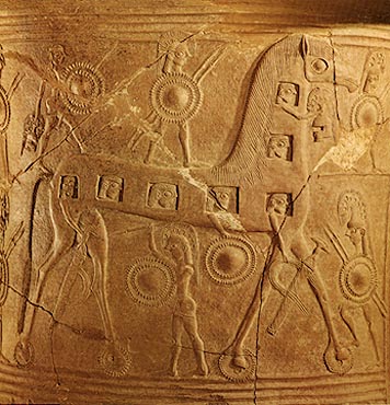 Detail from a pithos showing a relief of the descent of the Greeks from the Wooden Horse. Circa 670 BC. Archaeological Museum, Mykonos. Hellenic Ministry of Culture/Archaeological Receipts Fund. Kakridis, J. Th., Elliniki Mythologia, vol. 5: Troikos Polemos, Ekdotiki Athinon, Athens 1986, p. 145, fig. 120. © Hellenic Ministry of Culture
