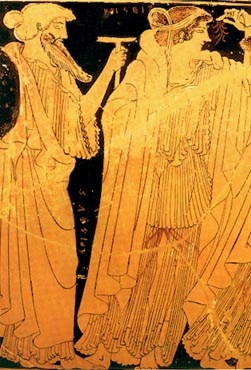 Detail from a red-figure skyphos, depicting the priest, Chryses, and his daughter Chryseis. 480 BC. Boston, Museum of Fine Arts 13186. Kakridis, J. Th., Elliniki Mythologia, vol. 5: Troikos Polemos, Ekdotiki Athinon, Athens 1986, p. 95, fig. 72. © Museum of Fine Arts, Boston.