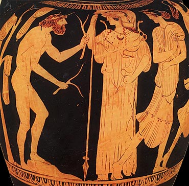 Detail from a red-figure amphora, representing the meeting between Odysseus and Nausicaa on the island of the Phaeacians. Between them, the goddess Athena is depicted. 450-440 BC. Munich, Staatliche Antikensammlungen 2322. Kakridis, J. Th., Elliniki Mythologia, vol. 5: Troikos Polemos, Ekdotiki Athinon, Athens 1986, p. 244, fig. 202. © Staatliche Antikensammlungen, Munich.