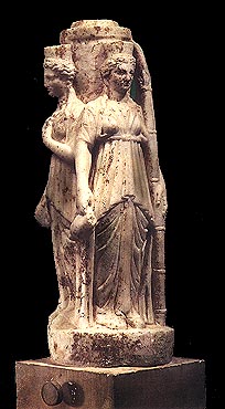 Statue of three-bodied Hecate, from the Roman bath-house at Sicyon. The figure wears a polos crown and holds a vase and a torch. This triple depiction is probably linked to the role Hecate had as goddess of the roads. Archaeological Museum, Sicyon. Hellenic Ministry of Culture/Archaeological Receipts Fund. Papachatzis, N., Archaia Corinthos: Ta Mouseia tis Corinthou, Isthmias kai Sikyonos, Ekdotiki Athinon, Athens 1993, p. 107, fig. 44.