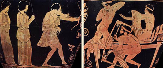 Using his bow, Odysseus attacks the suitors, who are trying to avoid his arrows. Detail from a red-figure vase. 5th century BC. Berlin, Staatliche Museen Preussischer Kulturbesitz. Christopoulos, G. (ed.), Istoria tou Ellinikou Ethnous, vol. 2: Archaikos