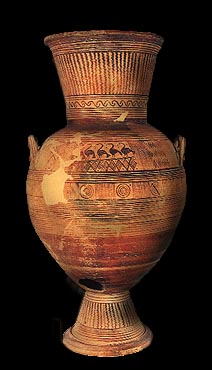 Urn with conical foot and neck. It is decorated with narrow bands and birds. Late 8th century BC. Archaeological Museum, Eretria ΜΕ 15429. Hellenic Ministry of Culture/Archaeological Receipts Fund. Sapouna-Sakellaraki, E., Eretria: Site and Museum, Hellenic Ministry of Culture/Archaeological Receipts Fund, Athens 1995, p. 74, fig. 55. © Hellenic Ministry of Culture