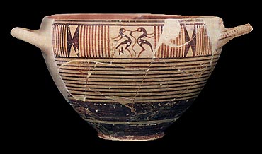 Kotyle from the Corinthian workshop at Zagora, Andros. 750-720 BC. The body of the vase is decorated with narrow bands. The decorative zone stretches between the handles, the subject being two birds fighting framed by groups of vertical lines and double axes. Archaeological Museum, Andros 2004. Hellenic Ministry of Culture/Archaeological Receipts Fund. Cambitoglou, A., Archaiologiko Mouseio Androu: Odigos, Athens 1991, table 55. © Hellenic Ministry of Culture
