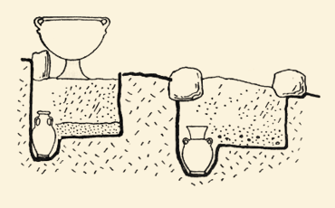 Reconstruction of Geometric graves with cremations from Athens. In a separate hole in the pit, an urn is placed, while the material of the cremation is scattered on the floor. Outside the grave, stone stelae and vases are placed as markers. Kurtz, D., Boardman, J., Ethima taphis ston archaio elliniko kosmo, Institouto tou Vivliou-M. Kardamitsa, Athens 1994, p. 42, fig. 4. © Deutsches Archaologisches Institut, Athens.