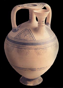 Stirrup jar, probably the product of the workshop of Kourtes in central Crete. Late 10th century BC. Even though the shape of the vase refers us to older models, the decoration with shaded triangles and concentric semicircles is characteristic of the Protogeometric period. Ð253. Hellenic Ministry of Culture/Archaeological Receipts Fund Marangou, L., (ed.), Minoikos kai Ellinikos Politismos apo tin syllogi Mitsotaki, N.P. Goulandris Foundation-Museum of Cycladic Art, Athens 1992, p. 136, fig. 140. © Hellenic Ministry of Culture