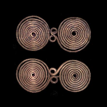 Two figure-of-eight bronze fibulae from the cemetery of Tymvoi, Vergina. They were used for fastening the garment on the shoulder. First half of the 9th century BC. Archaeological Museum, Thessaloniki ÁÇ.ÉÉ.ç-ç'. Hellenic Ministry of Culture/Archaeological Receipts Fund. Archaia Makedonia, Greek Ministry of Culture, The National Hellenic Commitee-ICOM, International Cultural Corporation of Australia, Athens 1988, p. 175, fig. 97. © Hellenic Ministry of Culture