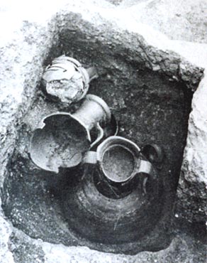 Pyre of the Protogeometric phase from the cemetery of Kerameikos. At the bottom of the rectangular pit, the urn and other offerings are discernible. Kubler, K., Kerameikos, Ergebnisse der Ausgrabungen V,1: Die Nekropoledes 10. bis 8. Jahrhunderts, Archaologisches Institut des Deutchen Reiches, Walter de Gruyter & Co., Berlin 1954, table 6. © Deutsches Archaologisches Institut, Athens.