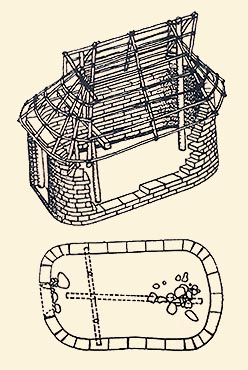 Reconstruction of an oval house of the 8th century BC from Smyrna. Snodgrass, A.M., The Dark Age of Greece, Edinburgh University Press, Edinburgh 1971. Drawing: R.V. Nicholls. © The British School at Athens.