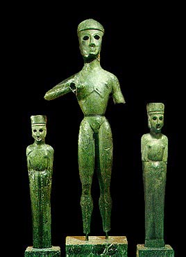 Three bronze statuettes from the temple of Delphinios Apollo in Dreros, c. 700 BC. They probably represent Apollo, his mother Leto and his sister Artemis. Archeaological Museum, Herakleion 245-47. Hellenic Ministry of Culture/Archaeological Receipts Fund. http://www.culture.gr/2/21/211/21123m/g211wm01.html © Hellenic Ministry of Culture