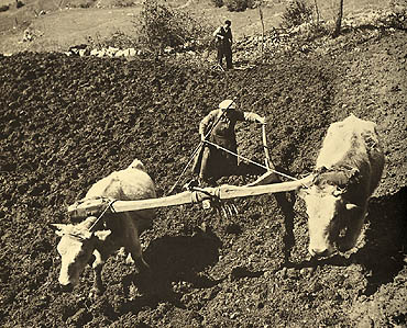 Traditional ploughing with a wooden plough.