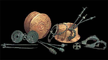 Burial customs provide considerable information about the economy and society of the period. A pyxis and bronze ornaments of a female garment from graves in Magnesia, Thessaly. 8th century BC. Volos, Athanasakeion Archaeological Museum. Hellenic Ministry of Culture/Archaeological Receipts Fund. Chourmouziades, G., Asimakopoulou-Atzaka, P. and Makris, K.A., Archaia Magnisia: To chroniko enos politismou, KAPON Editions, Athens 1982, p. 64, fig. 34. © Hellenic Ministry of Culture |