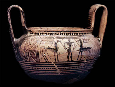 Geometric kantharos from a grave in Athens, with a representation of a warrior and two horses. Horses were a symbol of social prestige and financial prosperity. Third quarter of the 8th century BC. Acropolis Museum, Athens 630. Hellenic Ministry of Culture/Archaeological Receipts Fund. Dal Mito al Logos: La figura umana nell' arte greca (VIII-VI sec.a.c.), Palazzo Srozzi 16 September-16 November 1986, Hellenic Ministry of Culture, Direzione delle Antichita, p. 443, cat. no. 10. © Hellenic Ministry of Culture |