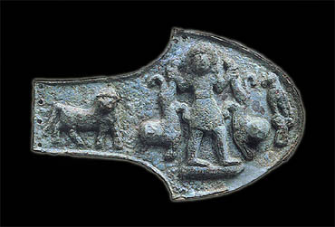 Bronze horse blinker from Eretria. It is the product of a northern Syrian workshop and is decorated with a representation of the "Potnios Theron" (Master of Animals). It was found in a storage pit close to the temple of Daphnephoros Apollo along with other artefacts of northern Syrian origin. 9th century BC. Archaeological Museum, Eretria ME 7007. Hellenic Ministry of Culture/Archaeological Receipts Fund. Sapouna-Sakellaraki, E., Eretria: Site and Museum, Hellenic Ministry of Culture/Archaeological Receipts Fund, Athens 1995, p. 78, fig. 58. © Hellenic Ministry of Culture