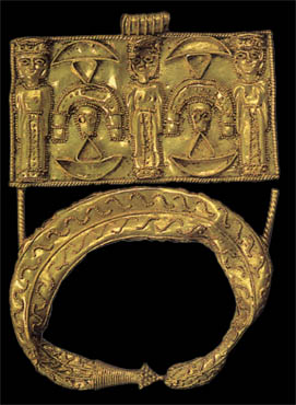 Gold pendant from the Idaean Cave. It is probably a fusion of two different pieces of jewellery, a rectangular plaque and a hollow ring of unequal thickness. Both the decoration and construction techniques are reminiscent of eastern models. 8th century BC. Athens, National Archaeological Museum, Athens Χρ 674. Hellenic Ministry of Culture/Archaeological Receipts Fund. Anatoliki Mesogeios: Kypros-Dodekanisa-Kriti 16os-6os aionas P. Ch., Archaeological Museum of Herakleion March-June 1998, University of Crete-Hellenic Ministry of Culture 23rd Ephorate of Prehistoric and Classical Antiquities, Herakleion 1998, p. 264, cat. no. 328. © Hellenic Ministry of Culture
