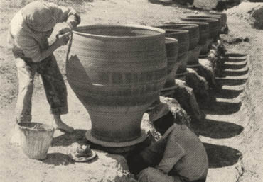 Traditional workshop of potters in Asomatoi, Crete. The potter's wheels have been placed inside clay pits in order to enable craftsmen to make life-size jars. Hampe, R. and Winter, A., Beitopfern und Topferinnen in Kreta, Messenien und Zypern, Romisch Germanischen Zentralmuseums Mainz editions, Mainz 1962, table 4. © Romisch Germanischen Zentralmuseums Mainz editions |