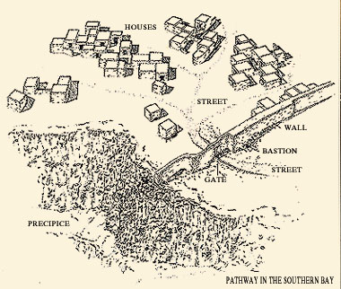 Reconstruction of the Geometric settlement and defensive wall of Zagora, Andros. The settlement was founded before 800 BC and abandoned in 700 BC. Cambitoglou, A., Archaiologiko Mouseio Androu: Odigos, Athens 1991, fig. 5. Drawing: J.J. Coulton. © The Archaeological Society at Athens.