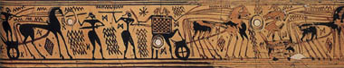 Scene from the Trojan War. Colour drawing from a representation on a Geometric oinochoe, in the Agora of Athens. 8th century BC. Agora Museum, Athens P 4885. Hellenic Ministry of Culture/Archaeological Receipts Fund. Drawing: P. de Jong. American School of Classical Studies at Athens: Agora Excavations. © Hellenic Ministry of Culture