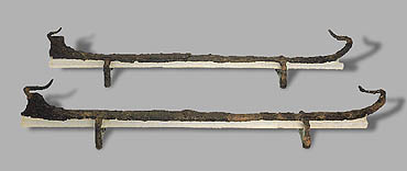 The technique of ironworking spread through Greece in the 11th century BC. Iron firedogs in the form of ships, found in a grave in Argos. 8th century BC. Archaeological Museum, Argos F10-F11. Hellenic Ministry of Culture/Archaeological Receipts Fund. Spathari, E., Armenizontas sto chrono: To ploio stin elliniki techni, KAPON Editions, Athens 1995, p. 70, fig. 77. © Hellenic Ministry of Culture