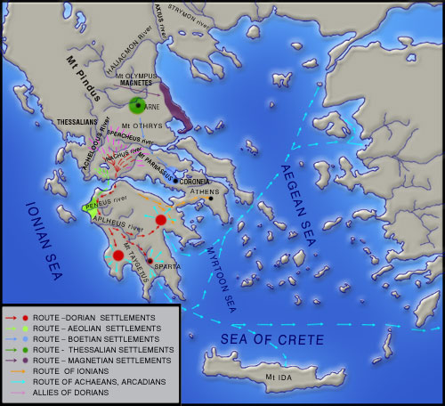 Map showing the migrations of the Greek tribes between 1125 and 1100 BC. Christopoulos, G. and Bastias, J. (eds.), Istoria tou Ellinikou Ethnous, vol. 2, Ekdotiki Athinon, Athens 1971, p. 20. Processing: Foundation of Hellenic World. © Ekdotiki Athinon.