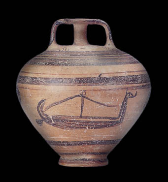 Stirrup jar from Skyros. Late Helladic IIIC period, 12th century BC. The belly bears a representation of a ship with a bird-shaped figure-head. The theme of the representation has been related to the 'Sea People' who, in this period, crossed the seas of the Mycenaean world in similar ships. Archaeological Museum, Skyros 77. Hellenic Ministry of Culture/Archaeological Receipts Fund. Sapouna-Sakellaraki, E., Skyros, Hellenic Ministry of Culture-Archaeological Receipts Fund, Athens 1997, p. 35, fig. 24. © Hellenic Ministry of Culture