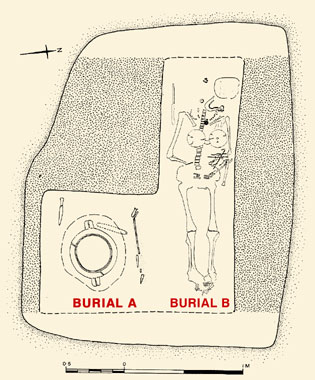 Plan of the south pit grave of the apsidal building in Lefkandi. A bronze vase with the ashes of the dead, a sword and a spear, as well as the burial of a woman with rich offerings, were found. Pophan, M., Caligas, P.G. and Sackett, L.H., Lefkandi II: The Protogeometric building at Toumba, Part 2: The excavation, architecture and finds, The British School of Archaeology at Athens, fig. 13. © The British School of Archaeology at Athens.