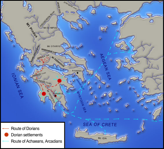The migrations of Greek tribes between 1125-1100 BC. The Dorians moved from central Greece to the Peloponnese and divided into three groups. They conquered Argos and Mycenae, the northern part of the Eurotas valley and the Messenian plain. Their raids caused sections of the older population to begin moving. Christopoulos, G. (ed.), Istoria tou Ellinikou Ethnous, vol. 2, Ekdotiki Athinon, Athens 1977, p. 20. Processing: Foundation of Hellenic World.