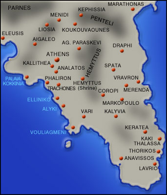 Map of Attica with the sites of the Geometric period. Between 740 and 700 BC, most of them show the first signs of habitation after the Mycenaean Age. Coldstream, J.N., Geometriki Ellada, Institouto tou Vivliou-B. Kardamitsa, Athens 1997, p. 179. Processing: Foundation of Hellenic World.