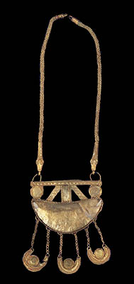During the 9th century BC, the commercial contacts of the Greeks with the East gave a boost to the art of the goldsmith. The photograph shows a gold necklace from a grave in Tekes, Knossos, c. 800 BC. The motifs and the shape of its parts are reminiscent of eastern models and of the Syro-Palestinian art in particular. Herakleion, Archaeological Museum, Herakleion X648. Hellenic Ministry of Culture/Archaeological Receipts Fund. Despoini, Aik., Elliniki Techni: Archaia Chrysa Kosmimata, Ekdotiki Athinon, Athens 1996, p. 126, fig. 107. © Hellenic Ministry of Culture