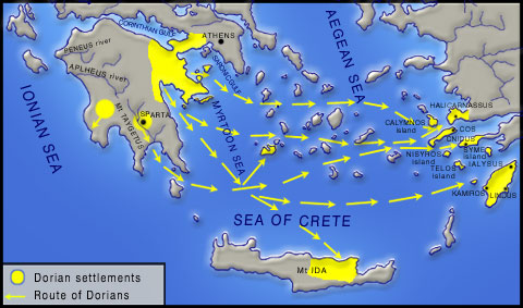 The route followed by the Dorians towards the coast of Asia Minor and their settlements. 950-800 BC. Christopoulos, G. (ed.), Istoria tou Ellinikou Ethnous, vol. 2, Ekdotiki Athinon, Athens 1977, p. 27. Processing: Foundation of Hellenic World.