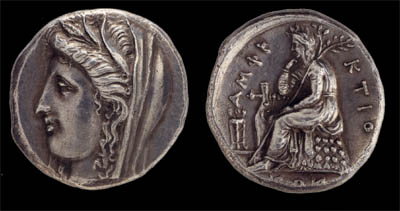 In 336 BC, the congress of the Delphic amphictyony decided to mint its own coinage. The photograph shows a silver stater of the amphictyonies, c. 336 BC. The reverse shows the god, Apollo, sitting on an omphalus and leaning on a lyre holding an olive branch. The representation is framed by the inscription AMPHICTIONON. Athens, Numismatic Museum 1898/99/KZ' 4. Hellenic Ministry of Culture/Archaeological Receipts Fund. Oikonomidou, M., Elliniki Techni: Archaia Nomismata, Ekdotiki Athinon, Athens 1996, p. 135, fig. 111. © Hellenic Ministry of Culture