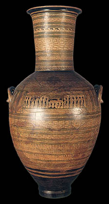 The grave vases of the Geometric period provide information about the social and economic status of the dead. Attic Geometric amphora from the Kerameikos. 755-750 BC. The vase served as a marker on the grave of a large aristocratic family. National Archaeological Museum, Athens 804. Hellenic Ministry of Culture/Archaeological Receipts Fund. Tiverios, M., Elliniki Techni: Archaia Angeia, Ekdotiki Athinon, Athens 1996, p. 50, fig. 2. © Hellenic Ministry of Culture