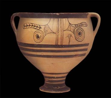 Krater from the Mycenaean settlement in Koukounaries, Paros. Late Helladic IIIC period, 12th century BC. This type of ware has been related to Mycenaean colonists who, after the destruction of their palaces, moved to the islands and founded new settlements there. Archaeological Museum, Paros 2027. Hellenic Ministry of Culture/Archaeological Receipts Fund. Dimakopoulou, Aik., O Miykinaikos Kosmos: Pente Aiones Proimou Ellinikou Politismou 1600-1100 p.Ch., National Archaeological Museum 15 December-31 March 1989, Hellenic Ministry of Culture-The National Hellenic Committee ICOM, Athens 1988, p. 161, fig. 114. © Hellenic Ministry of Culture