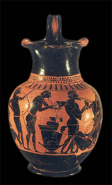 Black-figure oinochoe depicting the scene of a symposium. A young servant takes wine from the psykter which is then placed in a krater with chilled water. 520 BC. National Archaeological Museum, Athens 1045. Ministry of Culture/Archaeological Resources Fund. Villanueva-Puig, M.C., Images de la vie quotidienne en Grece dans l' antiquite,Hachette, Paris 1992, p. 63. © Hellenic Ministry of Culture |