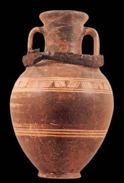 Protogeometric grave amphora, the shoulder of which is decorated with the iron sword of the dead. Archaeological Museum, Piraeus 6358. Hellenic Ministry of Culture/Archaeological Receipts Fund. Steinhauer, G., Ta mnimeia kai to archaiologiko mouseio tou Piraia, M. Toubis Editions, Athens 1998, p. 37. © Hellenic Ministry of Culture |