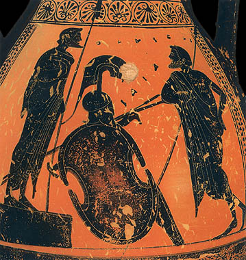 Black-figure pelike with a representation of Odysseus and Ajax competing for the armour of Achilles. Odysseus stands on a pedestal and delivers a speech whilst, to his right, Ajax listens to him. Between them lies Achilles' armour. 500 BC. Naples, Museo Archeologico Nazionale 3358. © Museo Archeologico Nazionale, Naples. |