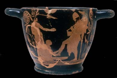 wound. Behind her stands Eumaeus, offering him some gift. 440 BC.