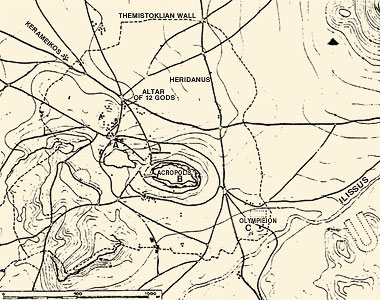Map of Athens during the Geometric period. Mazarakis-Ainian, M., From Rulers' Dwellings to Temples: Architecture, Religion and Society in Early Iron Age Greece, Paul Astroms Forlag, Jonsered 1997, fig. 123. Drawing: J. Travlos. © Paul Astroms Forlag. |