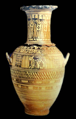 Attic hydria, on the neck of which four female figures are depicted dancing. They are probably performing a religious dance. Late 8th century BC. National Archaeological Museum, Athens 18435. Hellenic Ministry of Culture/Archaeological Receipts Fund. © Hellenic Ministry of Culture |