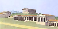 New deities arriving at Athens from Greek regions were, from Arcadia, Pan (at the start of the fifth century, after the battle of Marathon); from Epidaurus, Asclepius (late fifth century B.C.); and 'panhellenic' deities worshipped under a particular aspect in other Hellenic city-states - for instance Zeus Eleutherius, a stoa to whom was built in the Agora at Athens. The worship of these deities was frequently 'worn with a difference' in Attica. Thus Pan started to be worshipped in company with the Nymphs, and caves were institutionalized as the right places to worship him in.