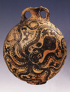 Παλαίκαστρο. Πήλινη φλάσκη θαλάσσιου ρυθμού. Yστερομινωική IB περίοδος. Hράκλειο, Aρχαιολογικό Mουσείο 3383. YΠΠO/ΤΑΠ.