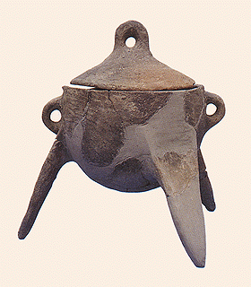 Poliochni, Red period (room 510). Tripod cooking pot with lid. Poliochni Limno en amihthaloessi. Ena kentro tis proimis epochis tou Chalkou sto Voreio Aigaio, Aegean Ministry, Hellenic Ministry of Culture-20th Ephorate of Prehistoric and Classical Antiquities--Scuola Archeologica Italiana di Atene, Athens 1997, p. 103, fig. 6. © Hellenic Ministry of Culture |