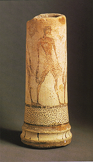 Melos, Phylakopi. Clay cylindrical vase stand with fishermen.