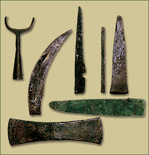 Mycenaean bronze tools: fork (Myrsinochori), sickle-shaped knife,